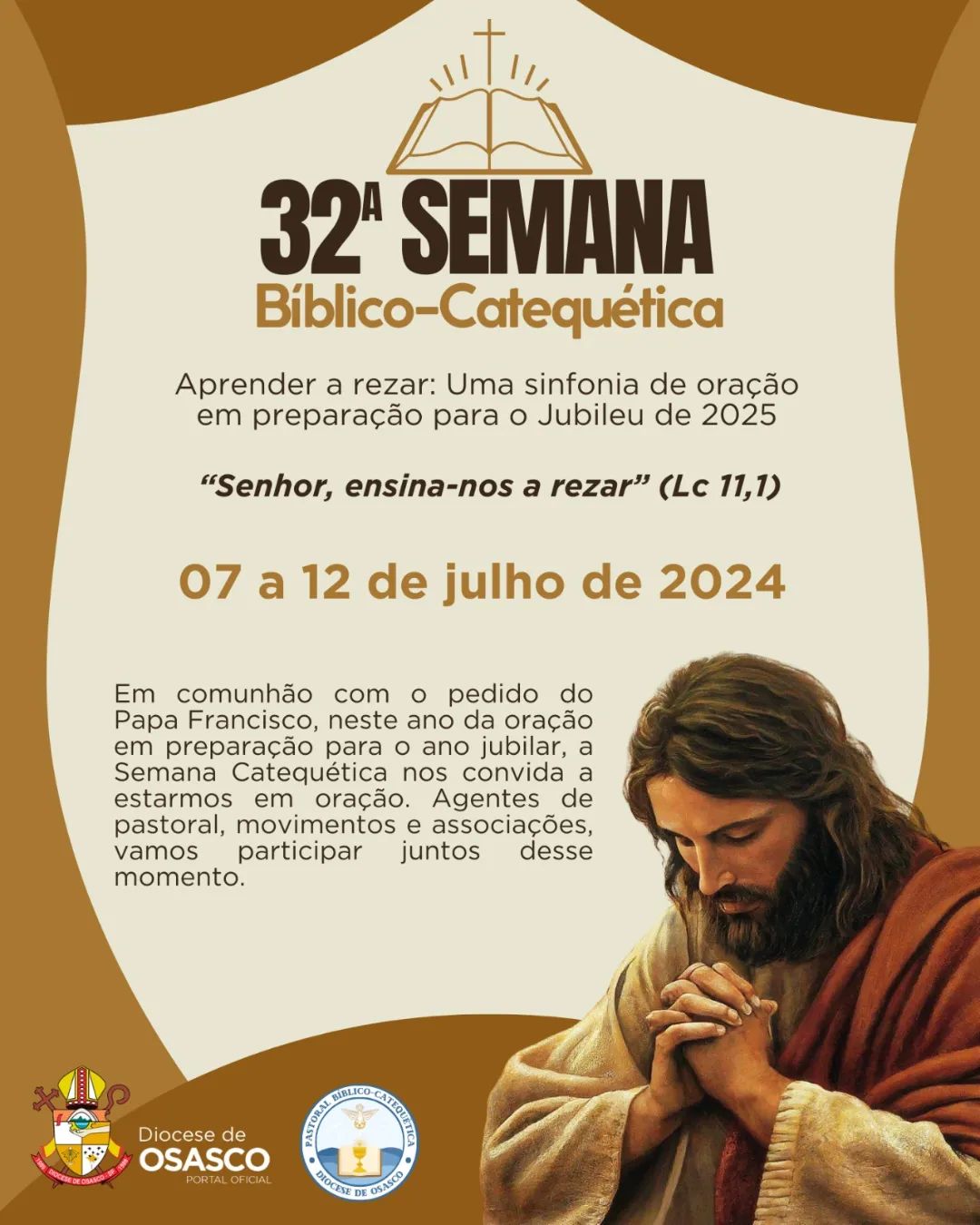 Em comunhão com o pedido do Papa Francisco, neste ano da oração em preparação para o ano jubilar, a Semana Catequética nos convida a estarmos em oração. Agentes de pastoral, movimentos e associações, vamos participar juntos desse momento.