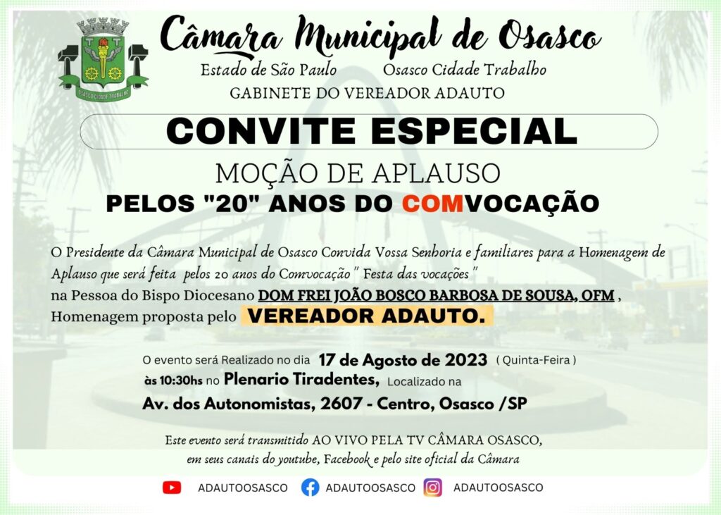 A Câmara Municipal de Osasco realiza uma Moção de Aplausos, na pessoa do bispo biocesano Dom Frei João Bosco Barbosa de Sousa, ofm, pelos 20 anos do evento ComVocação – a festa em prol das vocações sacerdotais.
