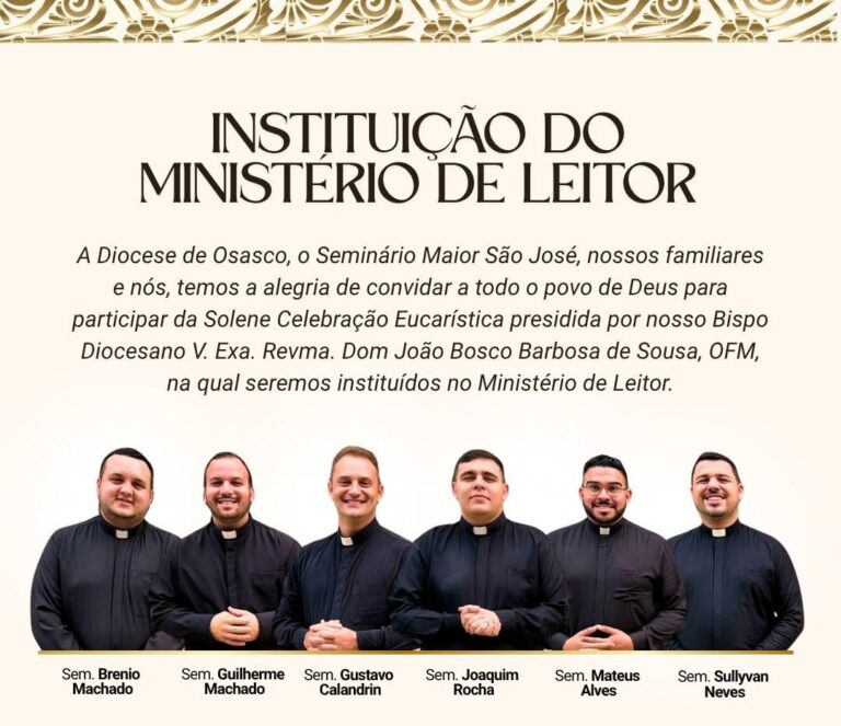 O Ministério de Leitor é um passo importante na caminhada formativa dos seminaristas rumo ao sacerdócio e marca o compromisso com o serviço da Palavra de Deus nas comunidades. No dia 17 de agosto, às 10h, a Diocese de Osasco celebrará a instituição do Ministério de Leitor de seis seminaristas do Seminário Maior São José […]