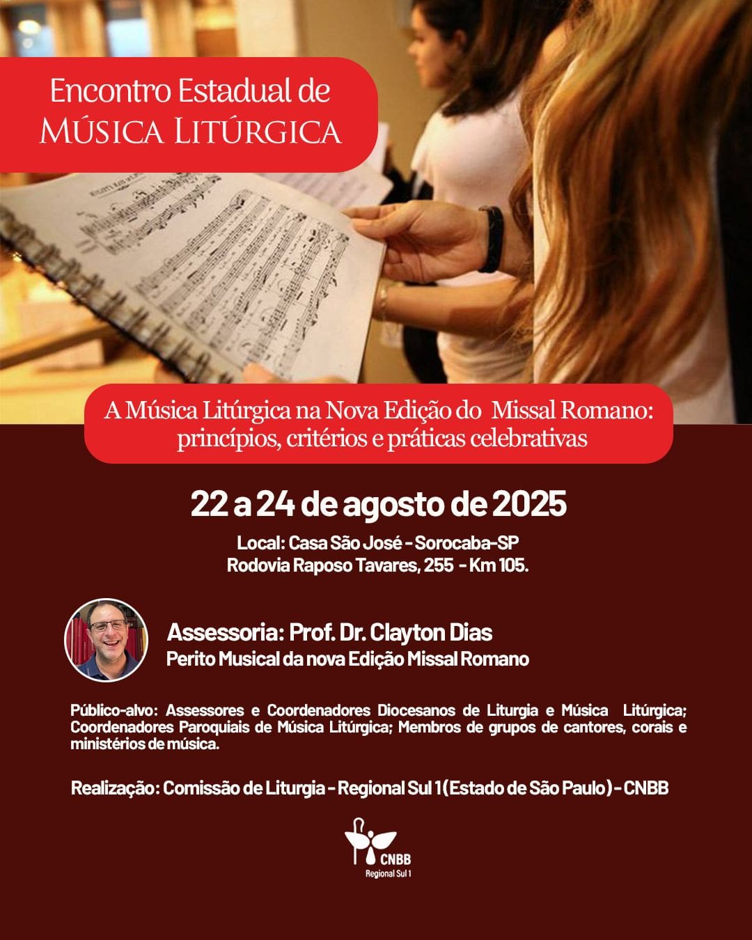 A Comissão de Liturgia do Regional Sul 1 da CNBB realizará, de 22 a 24 de agosto de 2025, o Encontro Estadual de Liturgia, com foco na música litúrgica e nas atualizações propostas pela nova edição do Missal Romano.