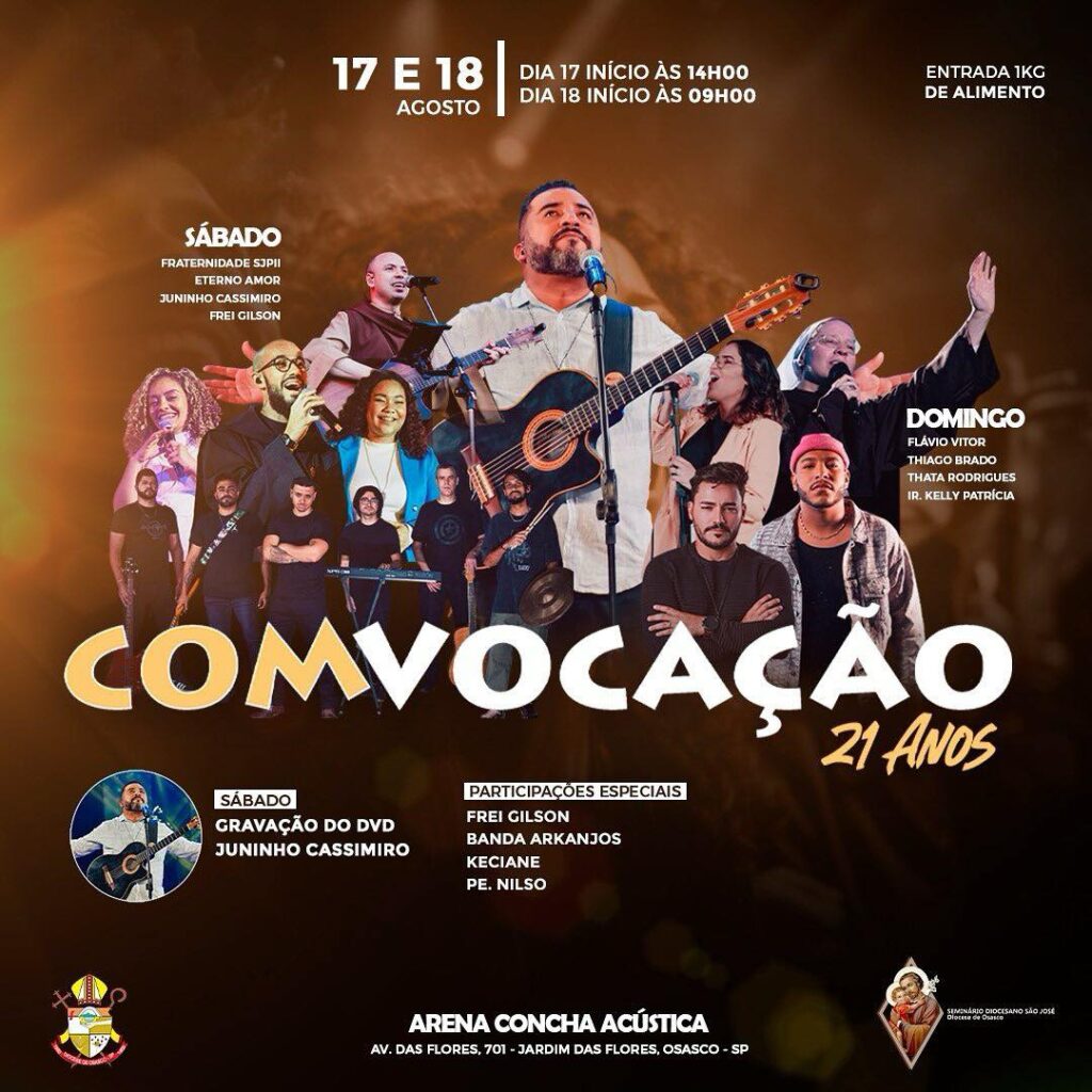 A Diocese de Osasco realiza nos dias 17 e 18 de agosto, na Concha Acústica da FITO, em Osasco, o ComVocação. A edição marcará a celebração dos 21 anos do evento organizado pelo Seminário Diocesano São José, cuja iniciativa tem por objetivo angariar recursos para suprir as necessidades materiais e de formação dos futuros sacerdotes.
