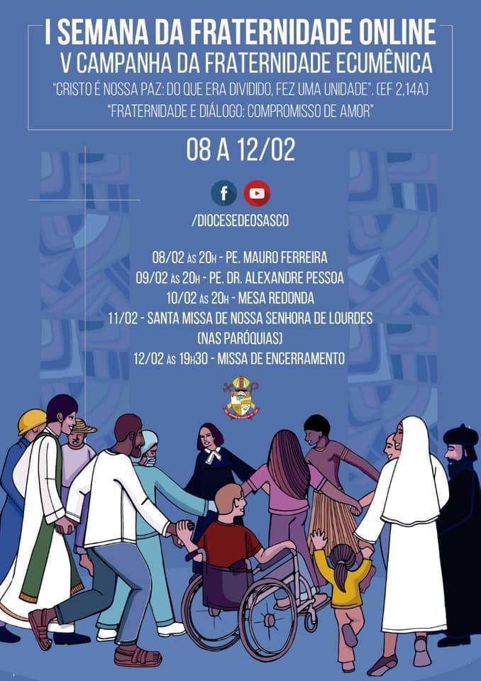 Para aprofundarmos o tema e o lema da CFE 2021 convidamos o clero, seminaristas, religiosos (as), ministros, catequistas, bem como todos os agentes de pastorais para participarem da 1ª Semana Da Fraternidade, um novo formato de formação, que será predominantemente online, pelas redes sociais de nossa Diocese de Osasco.