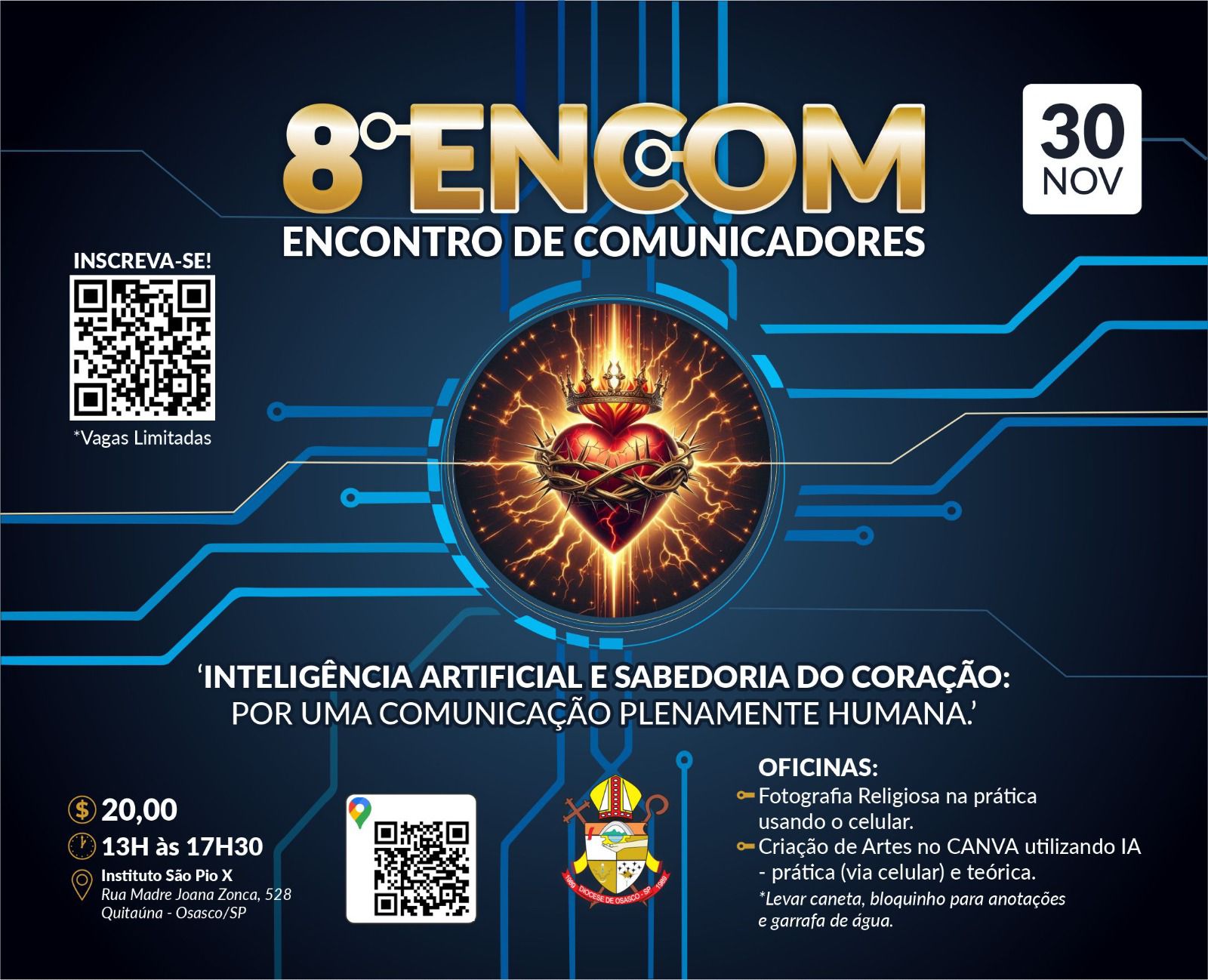 Vem aí, o 8° Encontro de Comunicadores (ENCOM), promovido pela nossa diocese. Neste ano, em um formato diferente: teremos duas oficinas itinerantes com prática em fotografia religiosa e criação de artes no Canva utilizando os recursos da Inteligência Artificial, tudo através do seu celular!