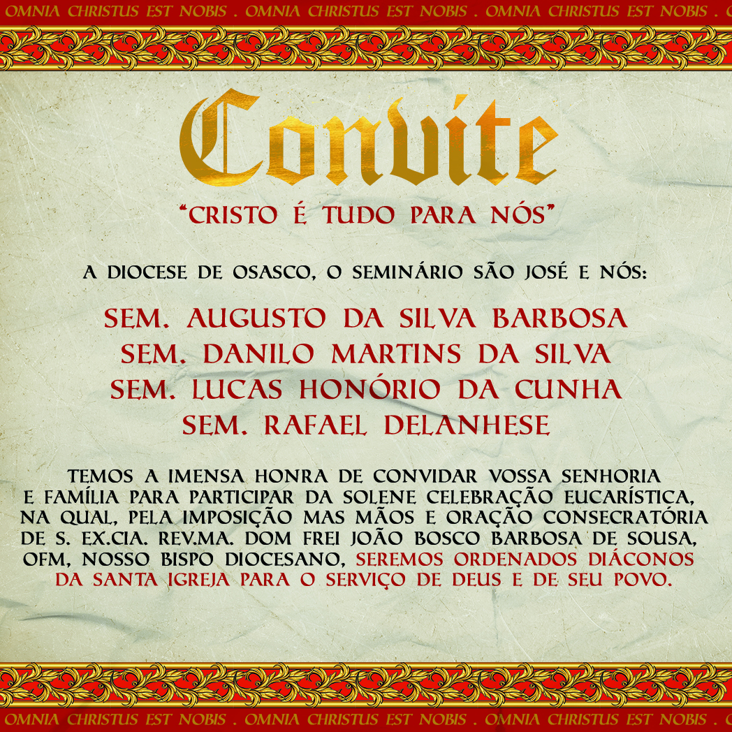 Temos a imensa honra de convidá-los a participar da Solene Celebração Eucarística, na qual, através da imposição das mãos e da oração consecratória de Sua Excelência, o Rev. Dom Frei João Bosco Barbosa de Sousa, OFM, bispo diocesano, serão ordenados diáconos da Santa Igreja para o serviço de Deus e do seu povo, os seminaristas: