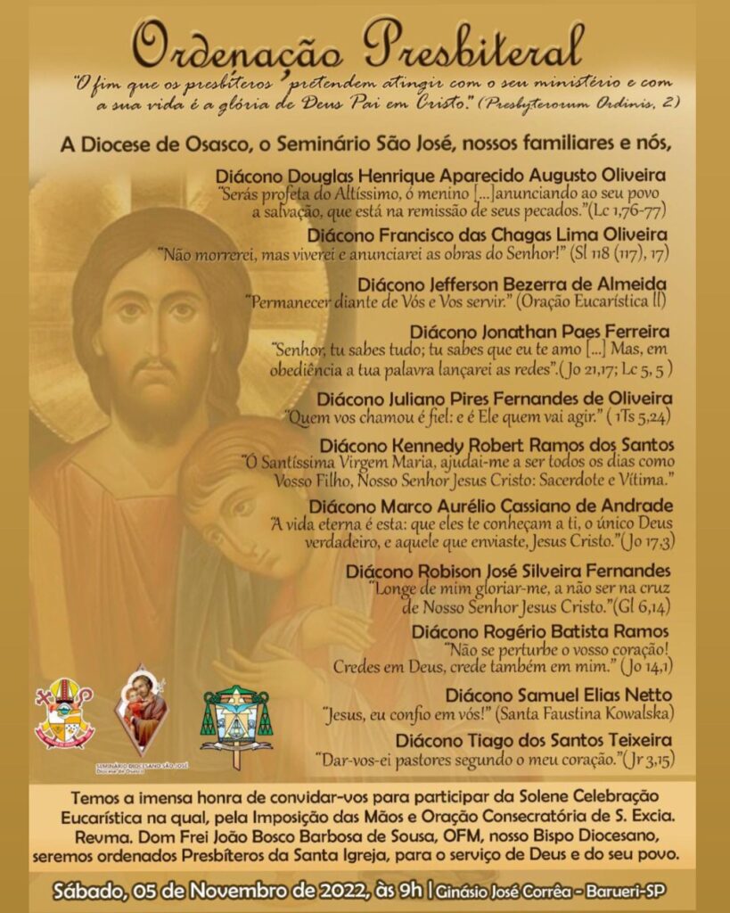 É com grande satisfação e gratidão a Deus, que convidamos você para a Ordenação Presbiteral de 11 novos sacerdotes da Igreja Particular de Osasco.
