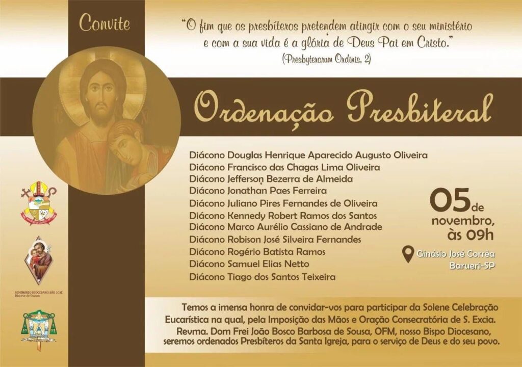 É com grande satisfação e gratidão a Deus, que convidamos você para a Ordenação Presbiteral de 11 novos sacerdotes da Igreja Particular de Osasco.