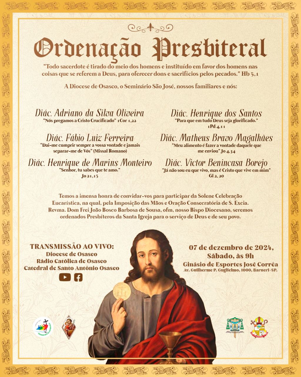 A Ordenação Presbiteral será dia 07 de dezembro, às 9h, no Ginásio José Correa em Barueri. Transmissão ao vivo pelas mídias sociais da Diocese de Osasco, Rádio Católica de Osasco e Catedral Santo Antônio.