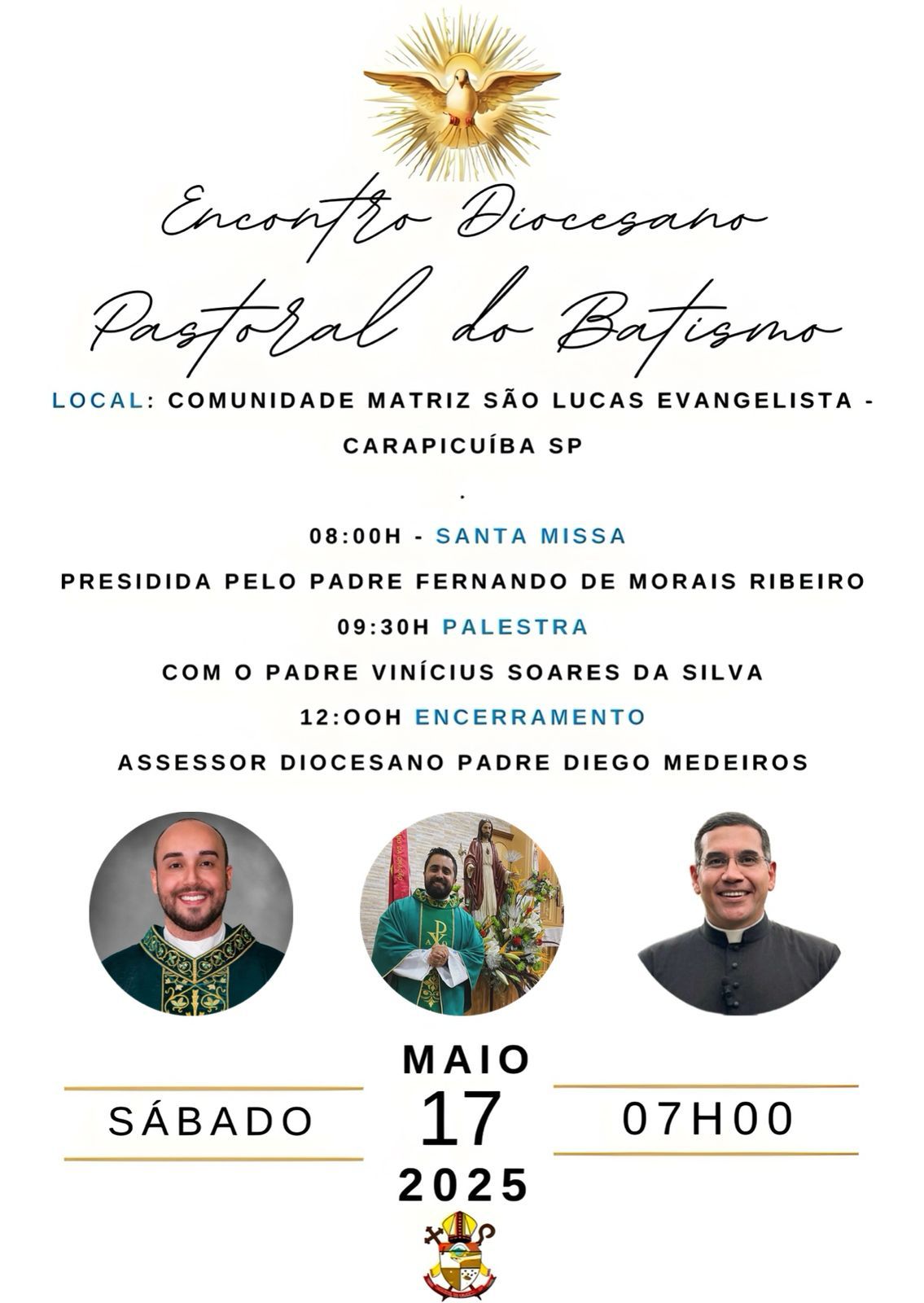 Com alegria e espírito de comunhão, convidamos todos vocês para o nosso Encontro Diocesano da Pastoral do Batismo, momento de formação, partilha e fortalecimento da missão que o Senhor nos confiou.