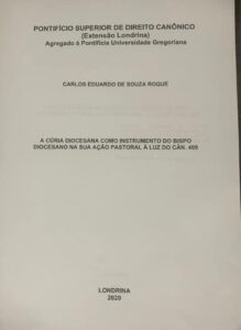 A apresentação realizou-se no dia 18 de novembro.  O tema da dissertação foi: “A Cúria diocesana como instrumento do Bispo diocesano na sua ação pastoral a luz do can. 469” tendo como orientador, Pe. Dr. João Carlos Orsi.