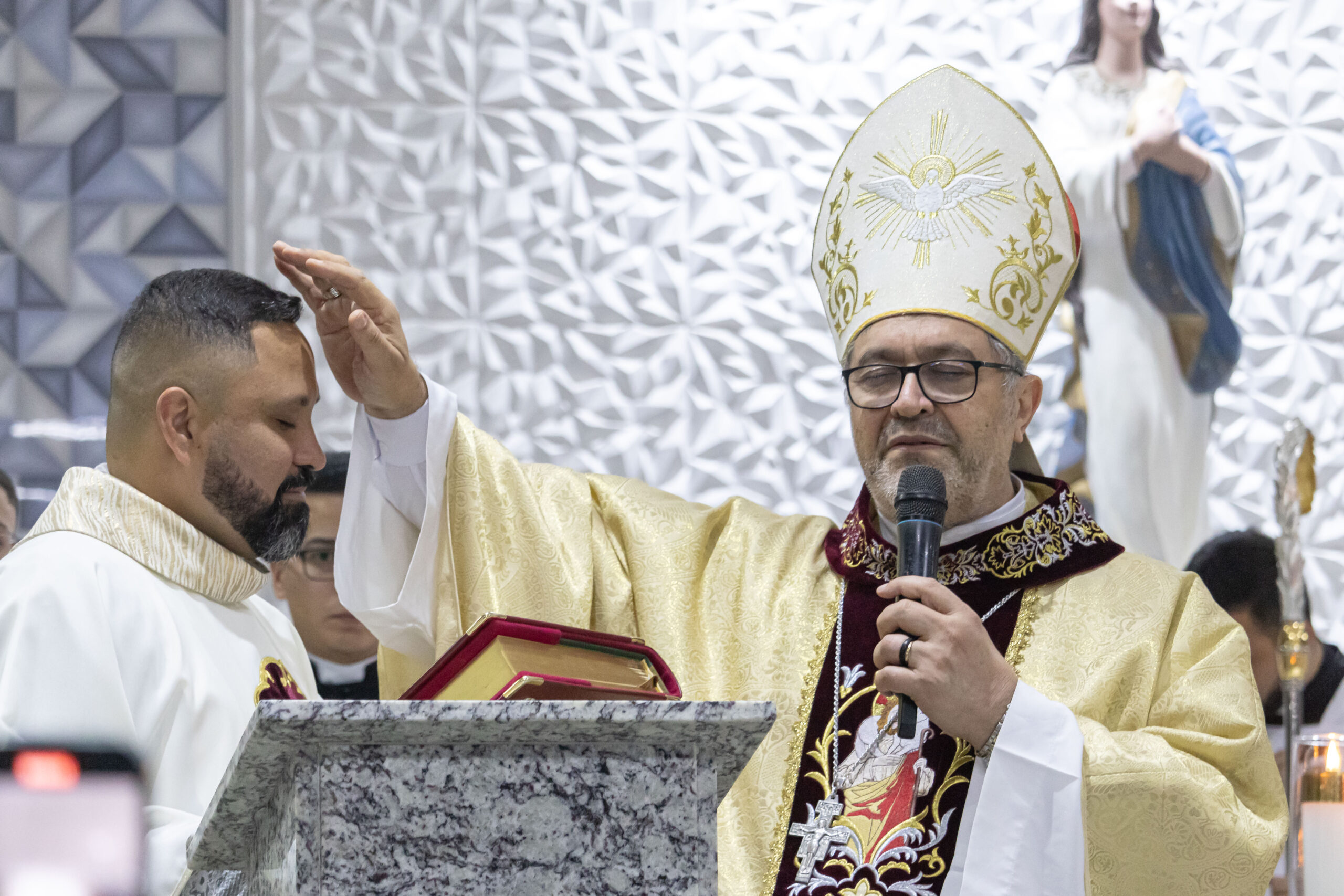 O sacerdote foi acolhido calorosamente por toda a paróquia, na Celebração Eucarística realizada no Centro Pastoral Imaculada Conceição, recebendo das mãos do bispo os Santos Óleos, a Estola e as chaves do Sacrário, assim como a Palavra de Deus.