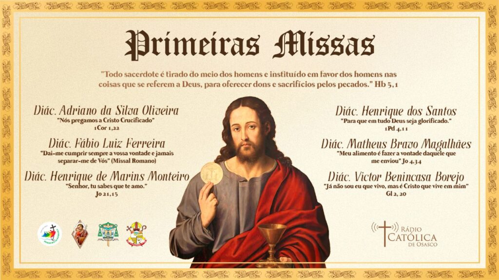 Os diáconos Adriano Oliveira, Fábio Luiz, Henrique Marins, Henrique Santos, Matheus Magalhães e Victor Borejo, serão ordenados presbíteros, no dia 07 de dezembro, às 9h, no Ginásio José Correa, em Barueri.