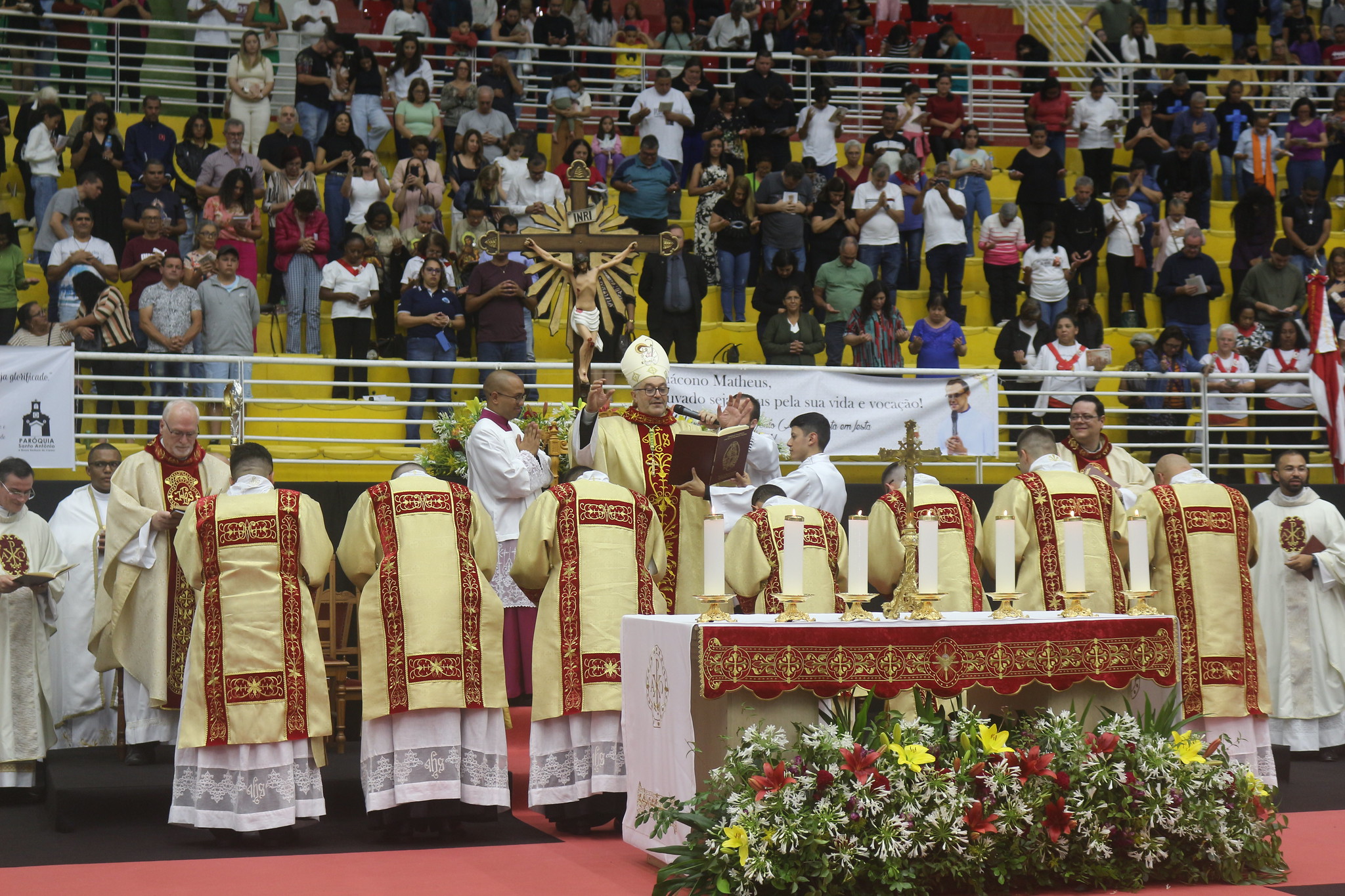 A Solene Celebração Eucarística teve início às 15h, no Ginásio de Esportes José Correa, no município de Barueri. Marcado de grande alegria e muita emoção, o rito que selou a entrega total dos ordenandos a Jesus Cristo e à Igreja, foi testemunhado por familiares, amigos e grande número de fiéis advindos das paróquias onde os seminaristas desenvolveram os seus estágios pastorais.