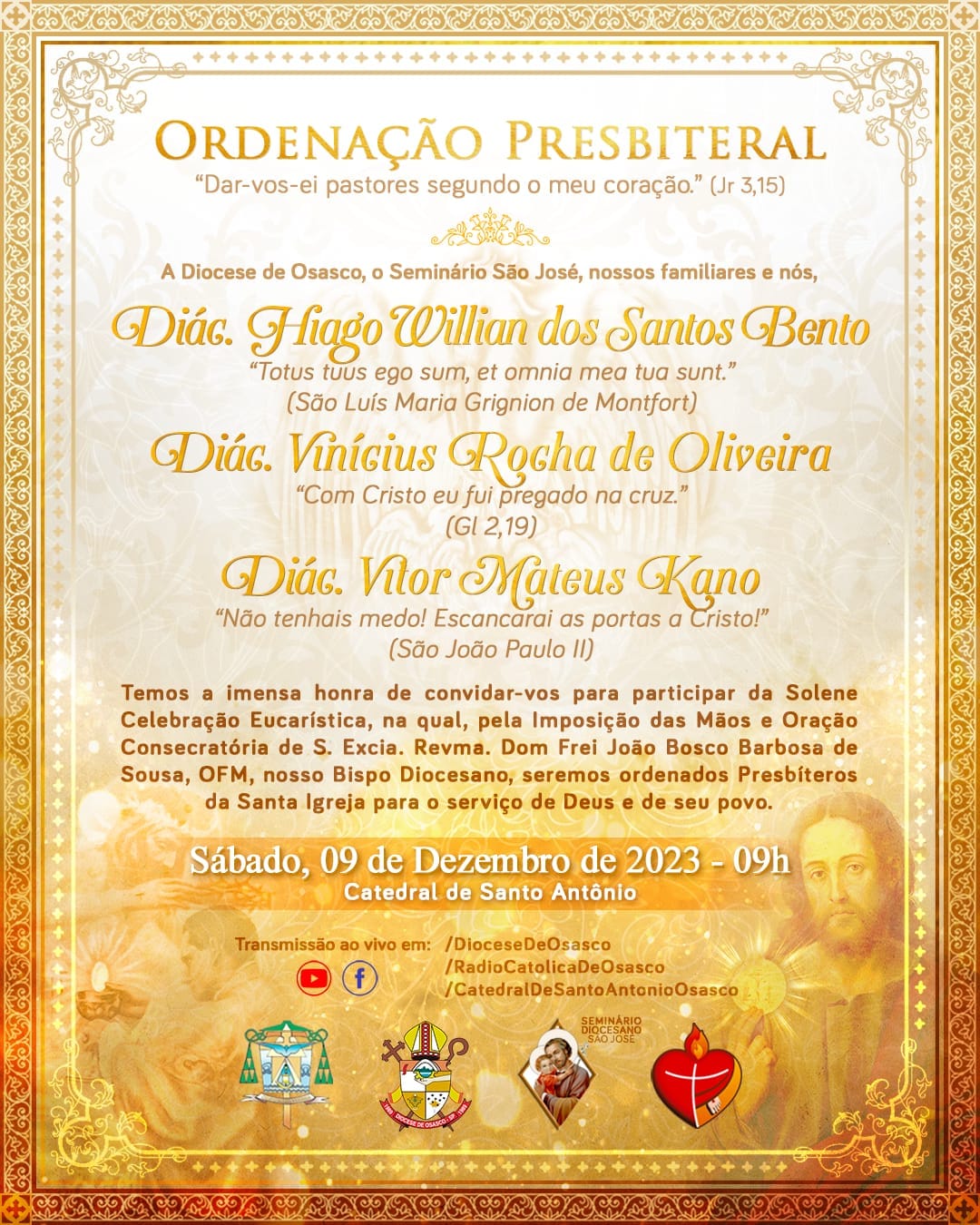 É com imensa alegria que nossa diocese se reunirá no dia 09 de dezembro para celebrar mais um momento importante para nossa Igreja de Osasco: a ordenação presbiteral dos diáconos Hiago Willian dos Santos, Vinícius Rocha e Vitor Kano.