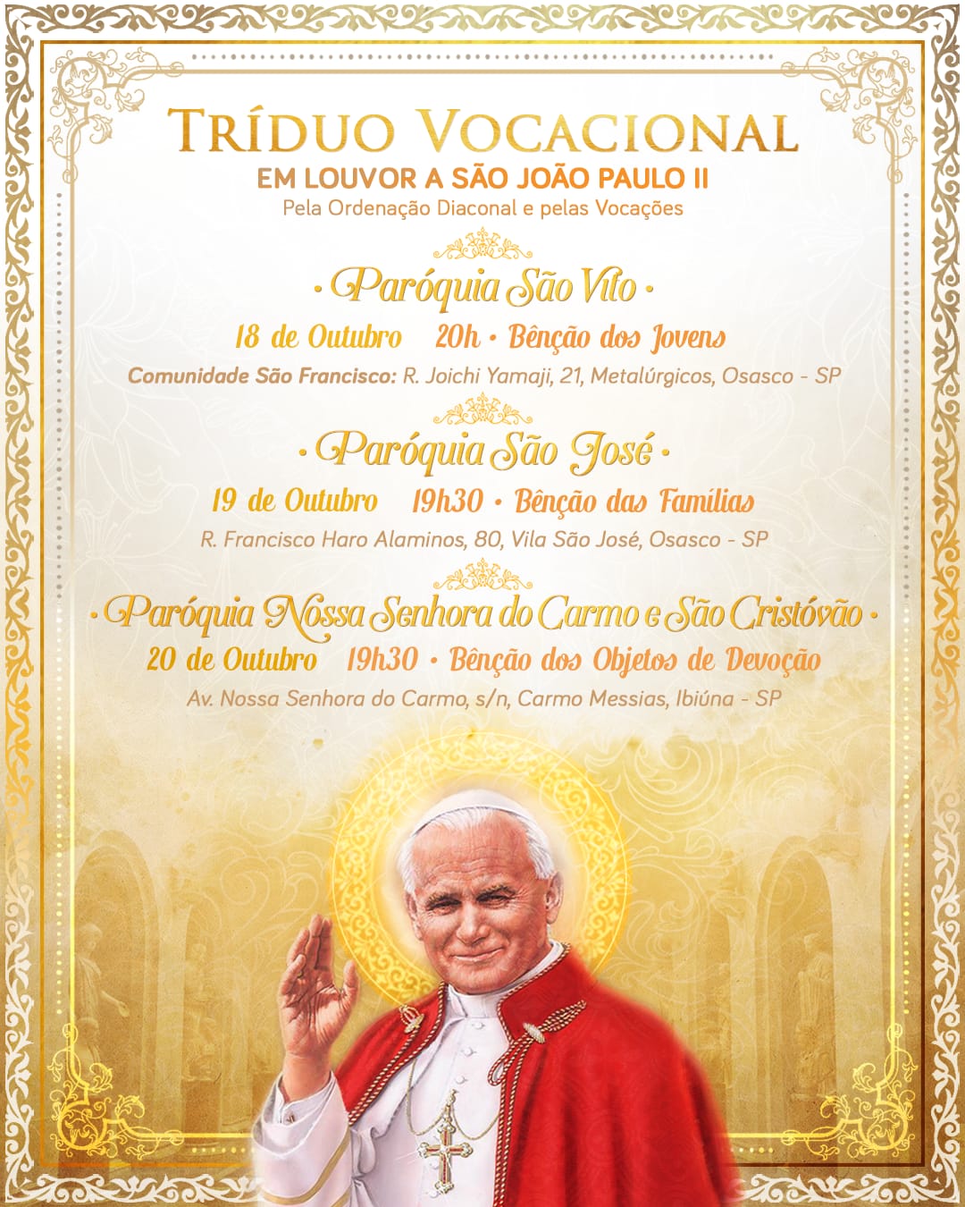 Dos dias 18 a 20 de outubro acontece o Tríduo Vocacional em louvor a São João Paulo II pela Ordenação Diaconal dos seminaristas Hiago Willian, Vinícius Rocha e Vitor Kano. O tríduo também tem como intenção a oração pelas vocações.
